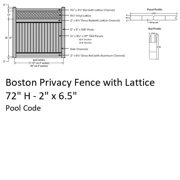 SOP Boston Privacy Fence 6' H x 8' W Section w/Lattice ClayBoston Privacy Fence 6' H x 8' W Section w/Lattice Clay - Pool CodeMFG: Superior Outdoor ProductsSFPRBOL7296CVinyl fencing is made to order from components. Typical lead times are 7-10 days. $545.50 / Each Details...