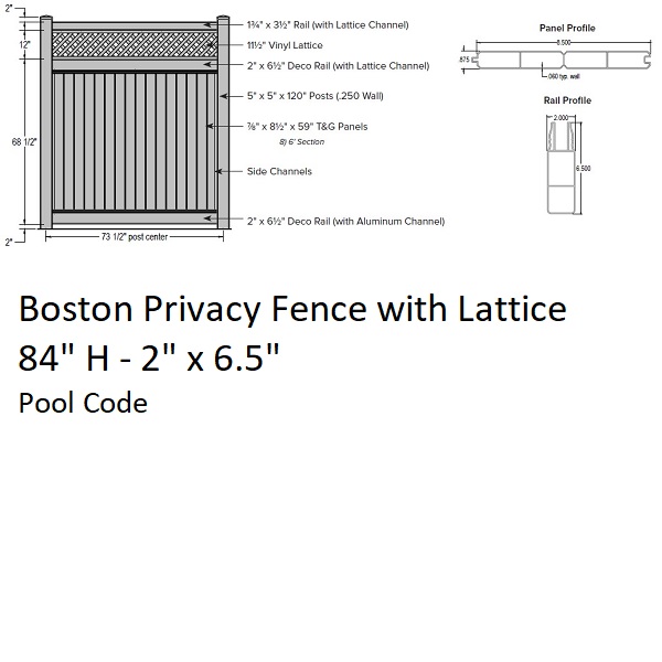 SOP Boston Privacy Fence 7' H x 6' W Section w/Lattice AlmondBoston Privacy Fence 7' H x 6' W Section w/Lattice Almond - Pool CodeMFG: Superior Outdoor ProductsSFPRBOL8472AVinyl fencing is made to order from components. Typical lead times are 7-10 days. $315.46 / Each Details...