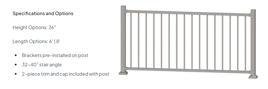 Discovery Series 36" x 8' Level Section w/Square Balusters Tex BlackDiscovery Series 36" x 8' Level Section w/Square Balusters Tex BlackMFG: KeylinkDISL36X8TBLNon-stock aluminum railings average a 4-6 week lead time. $232.10 / Each Details...