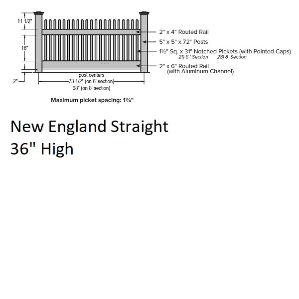 SOP New England Straight Picket Fence 3' H x 6' W Section AlmondNew England Straight Picket Fence 3' H x 6' W Section AlmondMFG: Superior Outdoor ProductsSFPNES3672AVinyl fencing is made to order from components. Typical lead times are 7-10 days. $145.99 / Each Details...