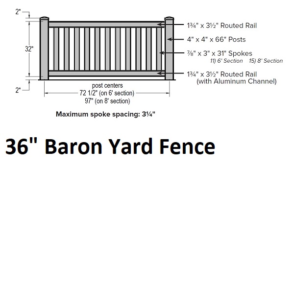 SOP Baron Yard Fence 3' H x 6' W Section WhiteBaron Yard Fence 3' H x 6' W Section WhiteMFG: Superior Outdoor ProductsSFYB3672WVinyl fencing is made to order from components. Typical lead times are 7-10 days. $83.12 / Each Details...