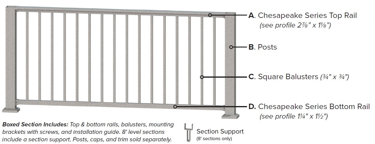 KFR Chesapeake Level Section Square Balusters 3' x 8' Matte WhiteKFR Chesapeake Series Level Section Square Balusters 3' x 8' Matte WhiteMFG: KeylinkCHSL36X8MWHNon-stock aluminum railings average a 4-6 week lead time. $440.77 / Each Details...