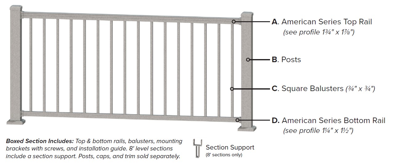 KFR American Series Level Section 3-1/2' x 8' w/3/4" Square Balusters Tex BlackKFR American Series Level Section 3-1/2' x 8' w/3/4" Square Balusters Tex BlackMFG: KeylinkAMSL42X8TBLNon-stock aluminum railings average a 4-6 week lead time. $335.04 / Each Details...
