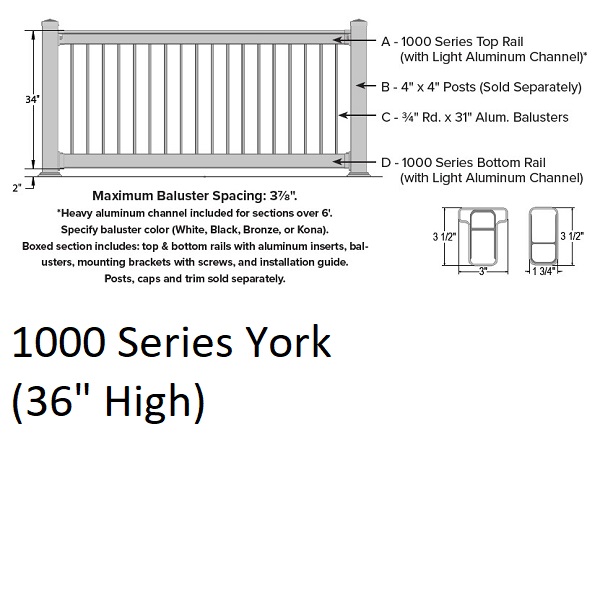 SOP 1000 Series York Level Section 3' x 6' White w/Black BalustersSOP 1000 Signature Series York Level Section 3' x 6' White w/Black Balusters MFG: Superior Outdoor ProductsSR1YOL36X6WBLNon-stock vinyl railings average a 3-4 week lead time. $233.01 / Each Details...