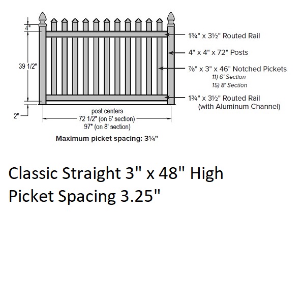 3" Classic Straight Picket Fence 4' H x 8' W Section White